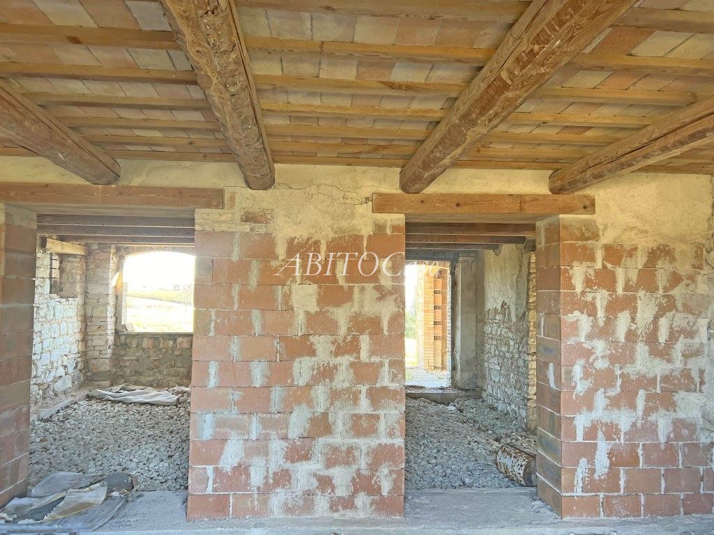 L’esterno è in pietra, tipica di questa zona e mattoni. La loro combinazione crea una sorta di colori e decori. Anche i soffitti riprendono la tradizione marchigiana, in legno e pianelle di cotto. Il tetto è rifatto.